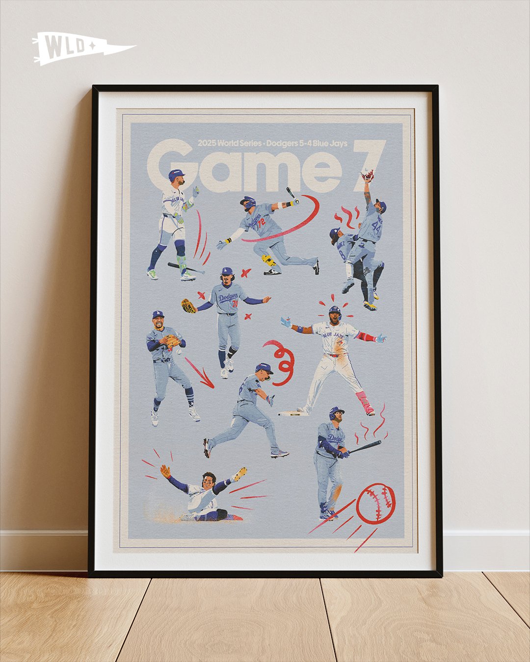 Original illustration celebrating Game 7 of the 2025 World Series, capturing all of the key moments from this epic contest.